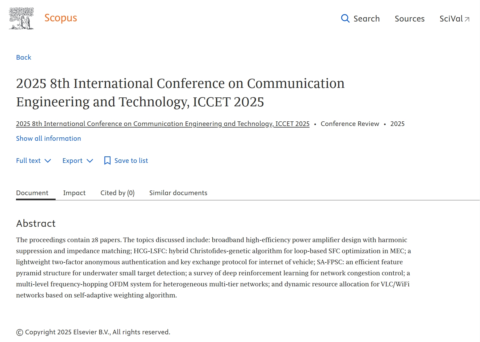 A glance through the list of presentations planned in this program reveals a diverse array of topics highly relevant to our lives and the field of communication engineering. These include Common phase error mitigation based on decision-directed data subcarriers in OFDM systems, Random Forest Stratified K-Fold Cross Validation for SYN DoS Attack detection in SD-IoV, and research on intelligent control technology for chicken house environments in large-scale poultry farms. Additional presentations will explore advancements in 5G and 6G network architectures, machine learning applications for network security, energy-efficient wireless sensor networks, and novel approaches to signal processing for real-time communication systems. These topics reflect the cutting-edge research and innovation driving the future of communication technologies, addressing both practical and theoretical challenges in the field.